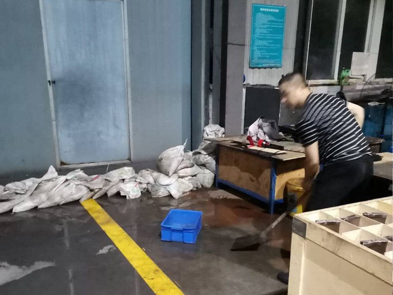 “雨水快漫入車間了,兄弟們加把勁砌好沙袋!”8月16日凌晨3點(diǎn),仟坤集團(tuán)黨委書記、集團(tuán)副總裁周述軍在鑫坤機(jī)械廠區(qū)車間指揮工人防洪搶險,因地勢原因鑫坤機(jī)械廠區(qū)的雨水逐漸漫過地臺,車間里全是機(jī)械設(shè)備和金屬器件,堵住即將漫入的雨水是當(dāng)務(wù)之急。排水、封堵刻不容緩,一排沙袋,兩排沙袋,慢慢構(gòu)筑起一道道堅(jiān)實(shí)的防線。隨著排水口的疏通水位下降,提到嗓子眼的心才逐漸放下。此時已是早晨八點(diǎn),但是周書記并未停下腳步調(diào)整休息,繼續(xù)帶領(lǐng)著各車間主任排查漏水和漏電的安全隱患。