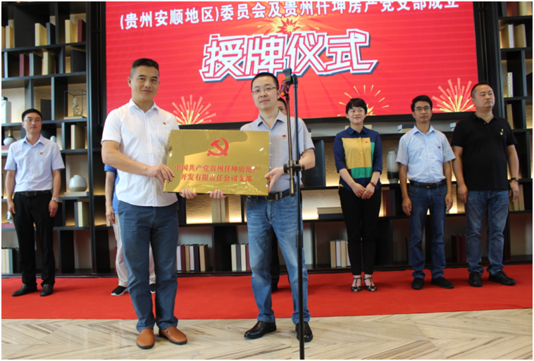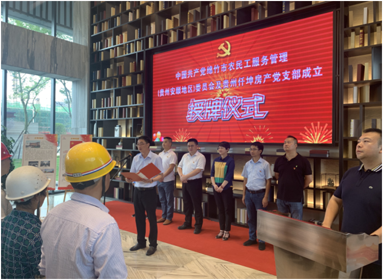 6月21日上午,中國共產(chǎn)黨綿竹市農(nóng)民工服務(wù)管理(貴州安順地區(qū))委員會(huì)及貴州仟坤房產(chǎn)黨支部成立授牌儀式在貴州安順仟坤.天朗售房中心隆重舉行。綿竹市市委常委、組織部部長李偉,貴州安順經(jīng)開區(qū)黨工委委員、紀(jì)工委書記雷珺茗,綿竹市高新區(qū)黨工委委員、紀(jì)工委書記馮曉敏,仟坤集團(tuán)總裁謝澤波,仟坤集團(tuán)黨委書記、副總裁周述軍,仟坤集團(tuán)黨建指導(dǎo)員劉佩章,貴州安順仟坤房產(chǎn)總經(jīng)理、黨支部書記秦永明出席儀式。本次授牌、揭牌儀式由仟坤集團(tuán)總裁謝澤波主持。